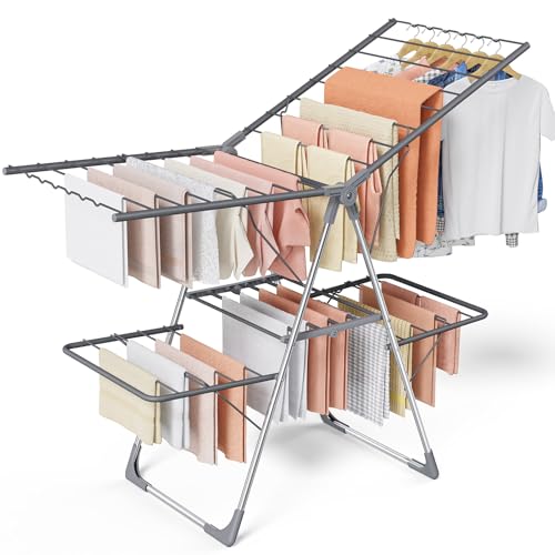 The over-all best value in drying racks can be found in the Honey-Can-Do DRY-01610 Heavy Duty Gullwing Drying Rack in white steel. It offers 46 linear feet of drying space with two pairs of shoe holders included. It has room to lay sweaters flat on the lower level, and has a nice mid-range price of $25.86.