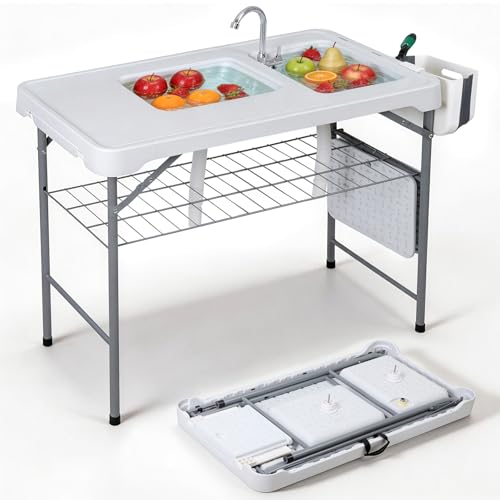 Some of the conveniences that can make cleaning fish less of a burden are on the Coldcreek Outfitters Ultimate Outdoor Work Station (Gray, 33X40X26-Inch table. Its height is almost the same as kitchen cabinets, and the durable polyethylene is lightweight and nonporous. Most tables do not have a deep sink, but this model has one that is 2.5” and another that is 5” for more efficient washing. Both sinks have a drain hose that can direct water away and into a desirable area. However, there is no faucet and no attachment for a garden hose even though the table has a price that is more than average.